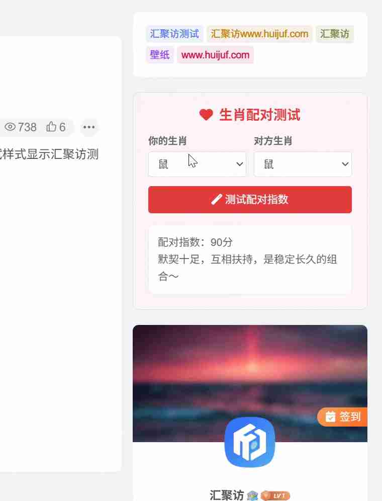 这是一款适配子比主题的趣味生肖配对小工具,此小工具适配所有主题和网站,部署后可自定义配对指数以及相关提示语,此小工具也是比较简约的,有能力的可以自己再美化美化,有需要的朋友自行部署吧!